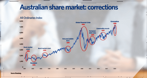 John Pearce (JP): It's a bit of a moving feast as you can imagine, Derek, and it will change by the time this video is aired. I think it's best to think about it from the peak to the trough in this latest selloff. Major markets, including Australia, are down about 20%. We have this graph in front of us here showing the latest decline. And a couple of points here, we are now in official ‘bear’ territory. You'll hear about people talking about a ‘bear market’. What I say to members when you hear that is, don't pay much attention. It's just a label, and the label ‘bear market’ doesn't say anything about the future—it just tells you that the market's down 20%. The other point is that these corrections are a lot more frequent than people might suspect. In fact, since the '80s, it's happened about eight times.