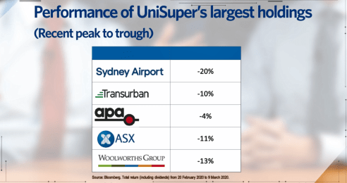 We also have to bear in mind that we've had 10 consecutive positive years. So it's almost the correction that we had to have. Let's look at UniSuper's situation. I'm sure that's what our members are more interested in. If you look at the performance of our five key holdings listed on this slide, you can see, not surprisingly, Sydney Airport has been the hardest hit of our main holdings. It’s pretty much fallen in line with the market, which I take some comfort from, actually—you'd expect it to even fall more given the draconian sort of measures that governments have put in around travelling.